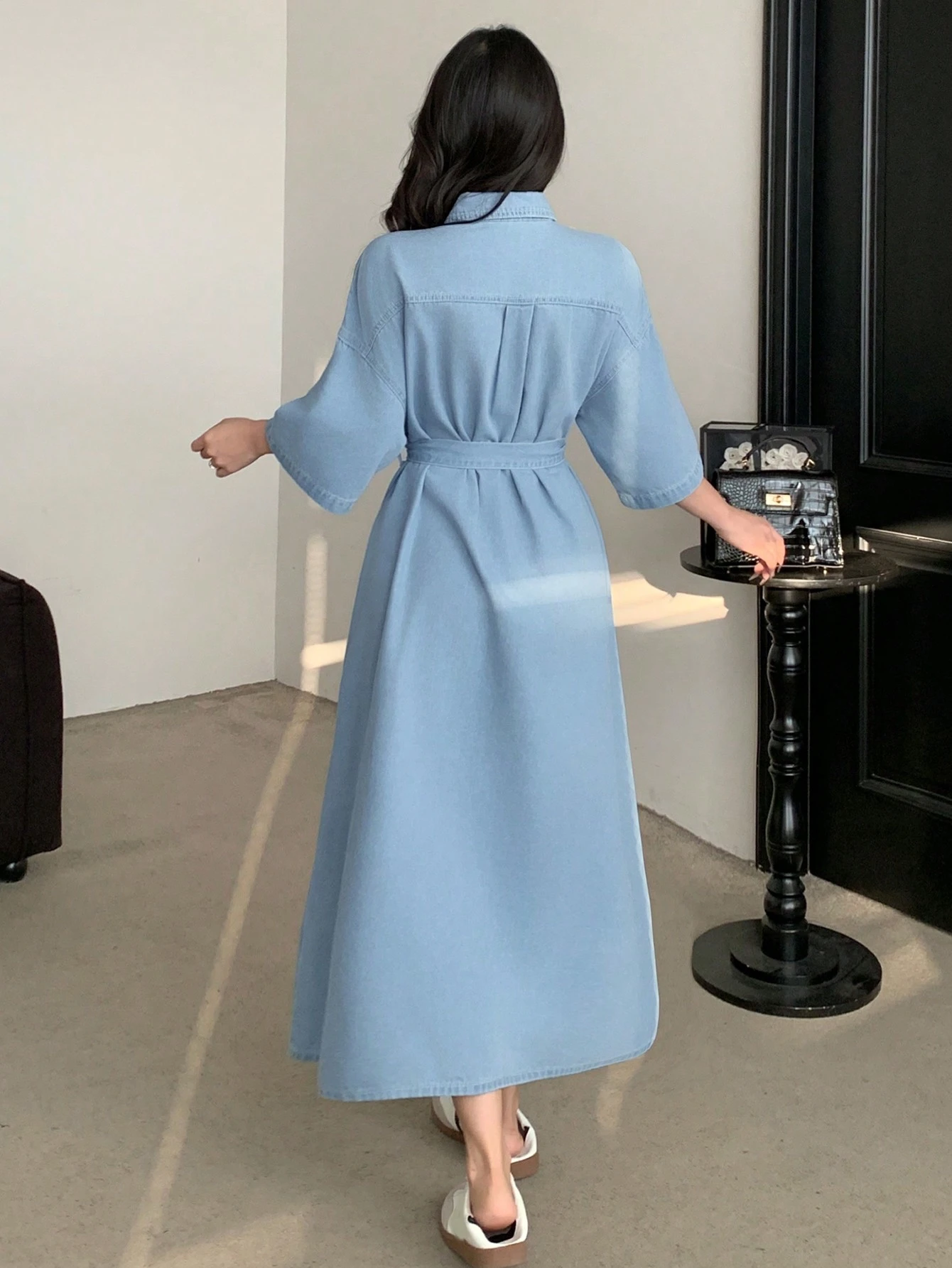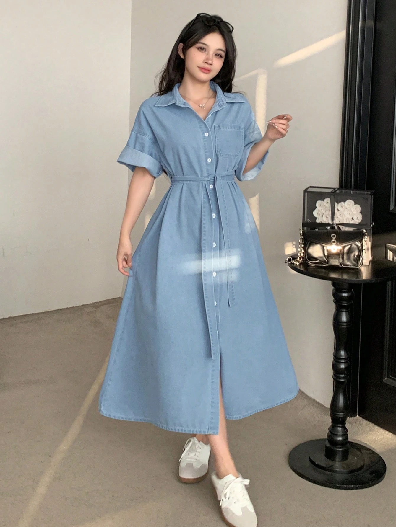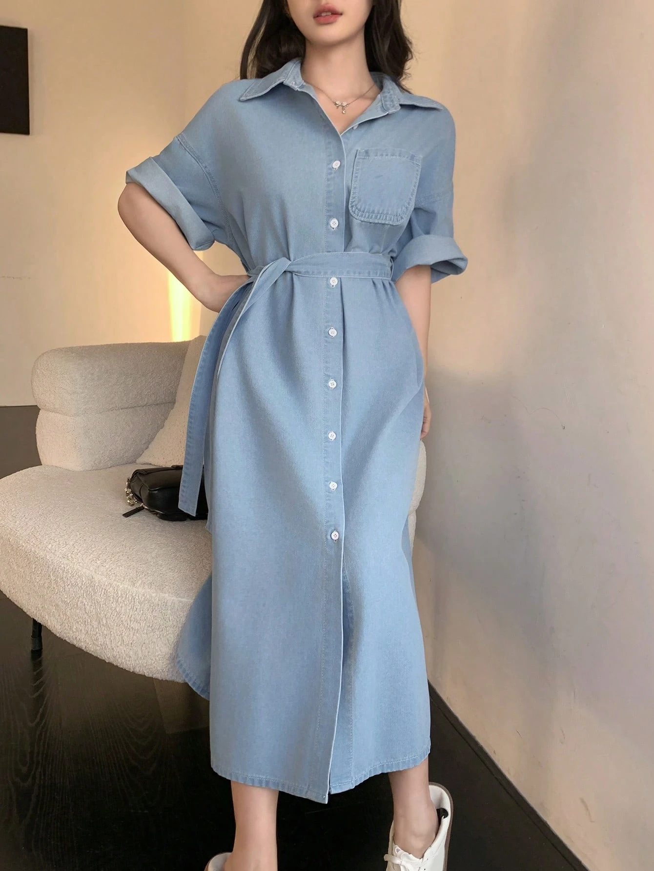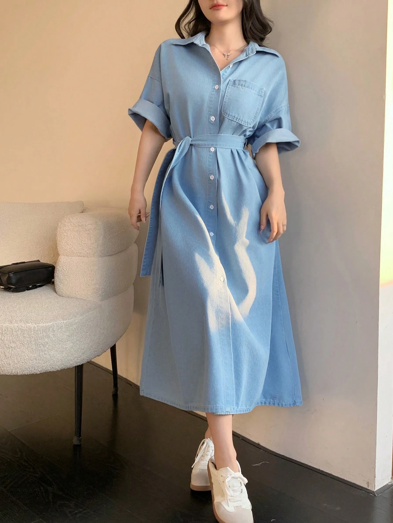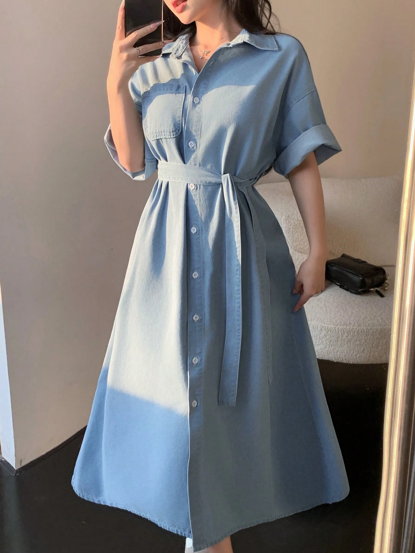 فستان دنيم كاجوال ذو جيب بأكمام قصيرة وأحادي الصدر للنساء