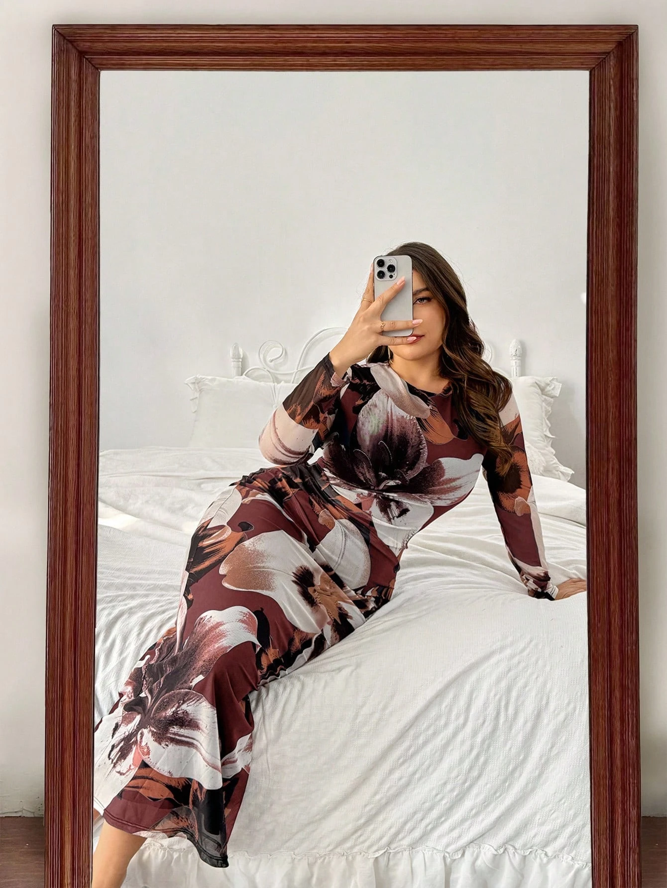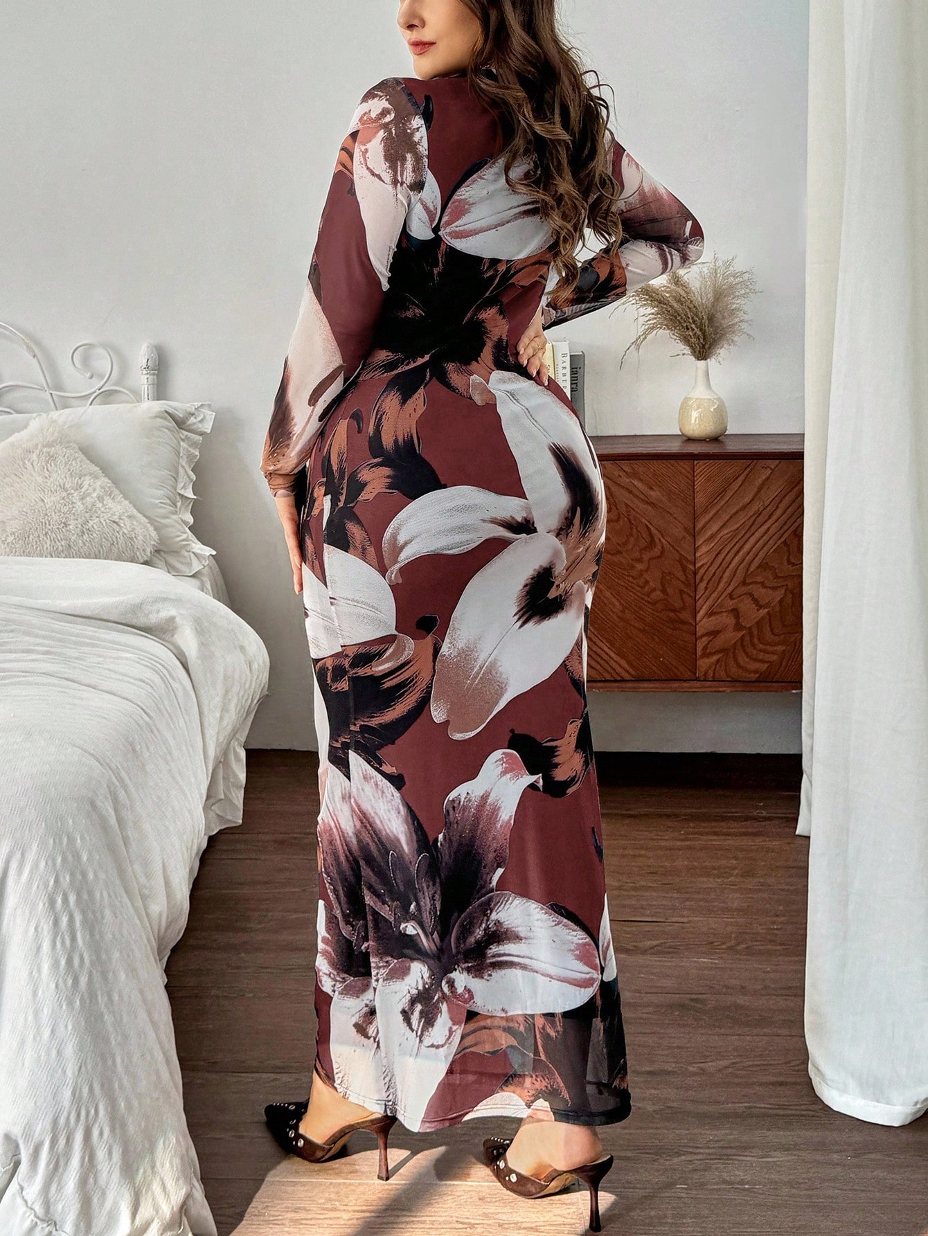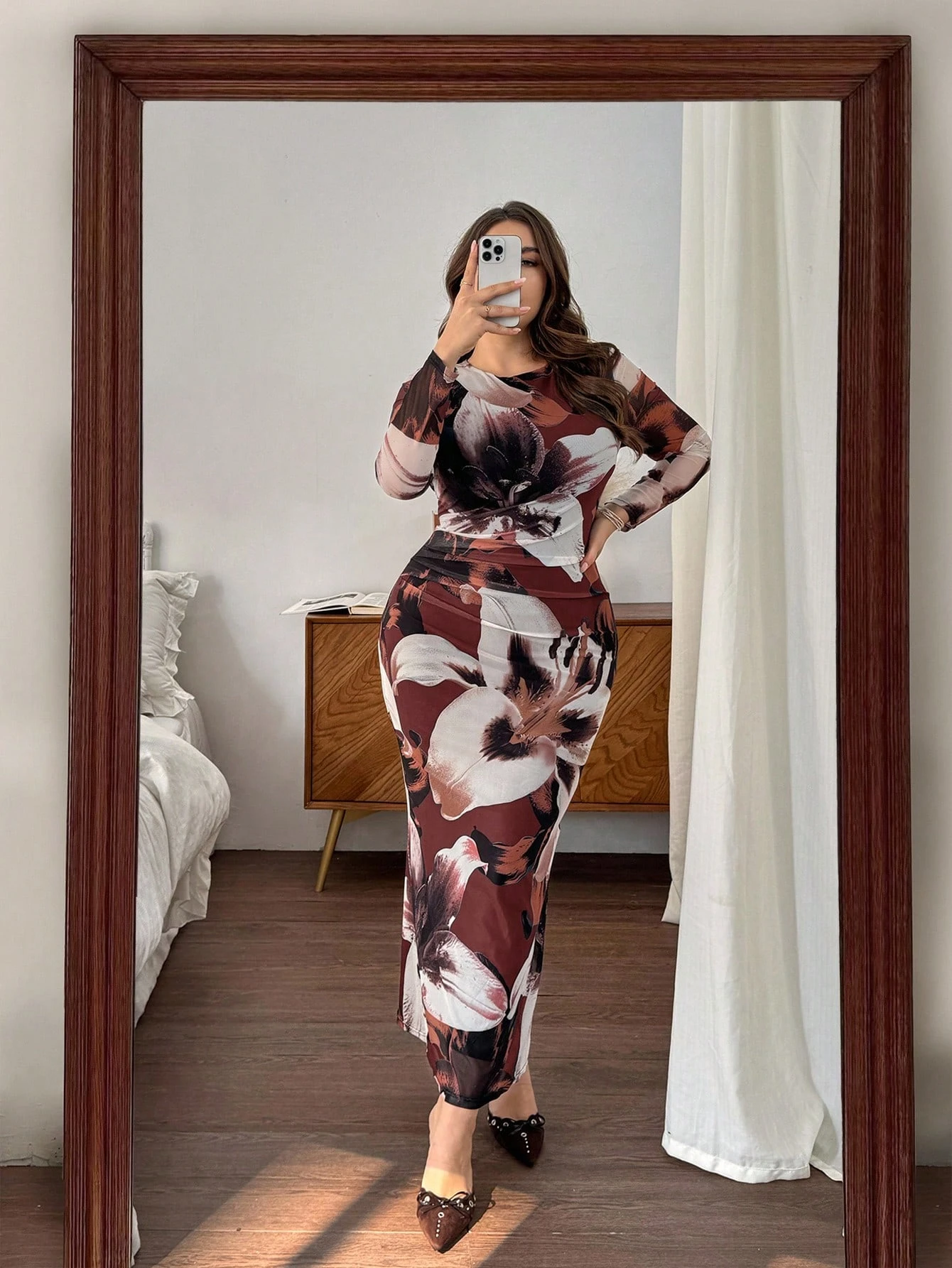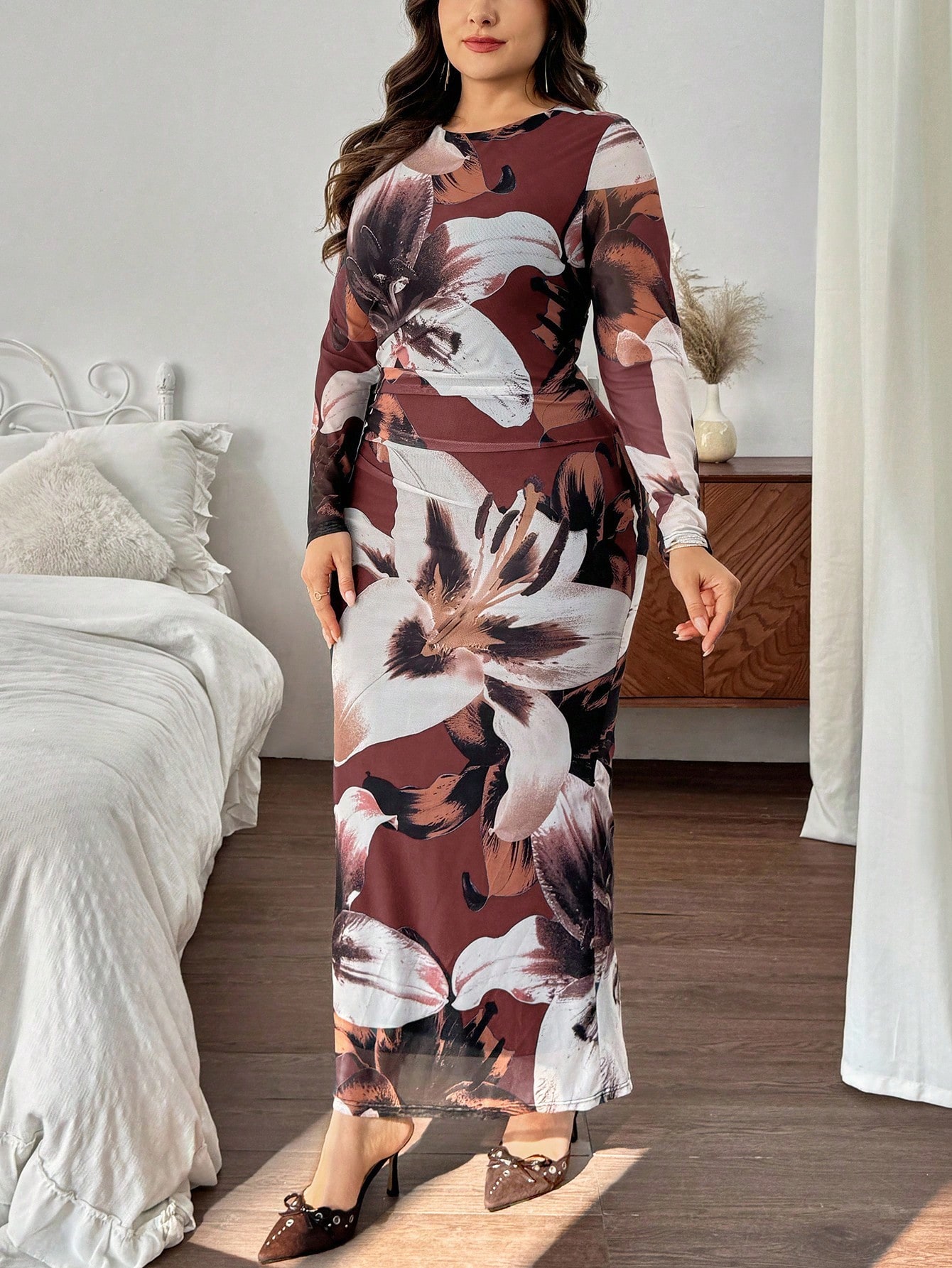 فستان طويل الأكمام محاك أنيق بطبعات الزهور ذو رقبة دائرية، مقاس كبير للنساء