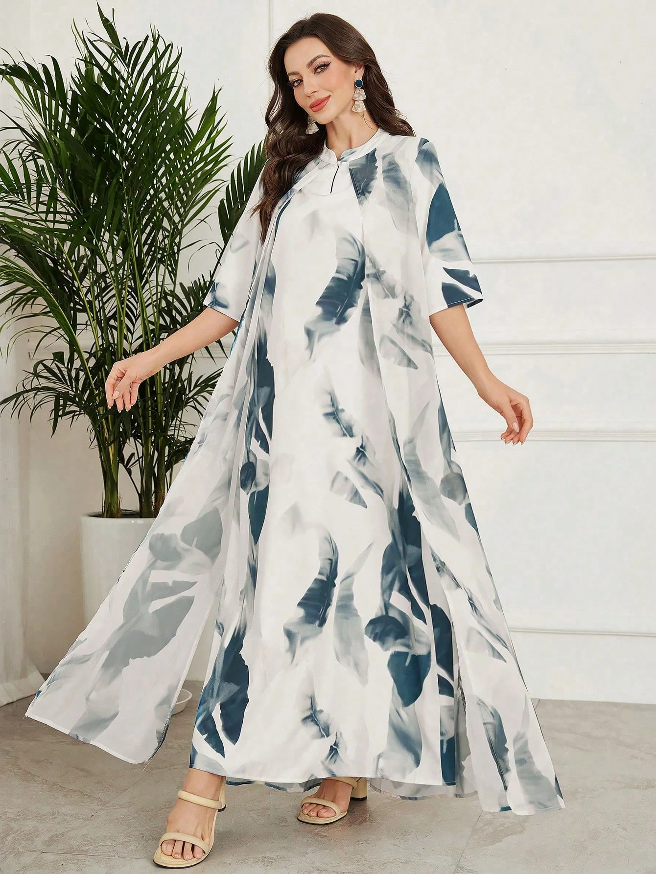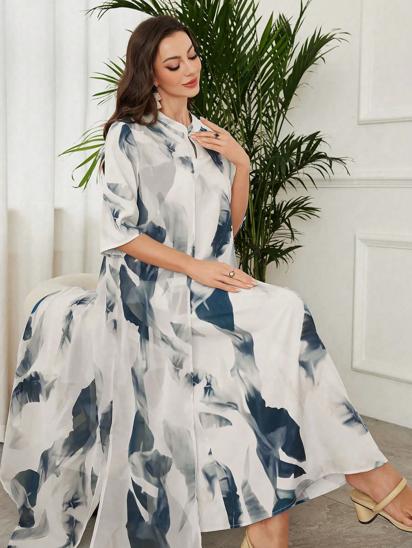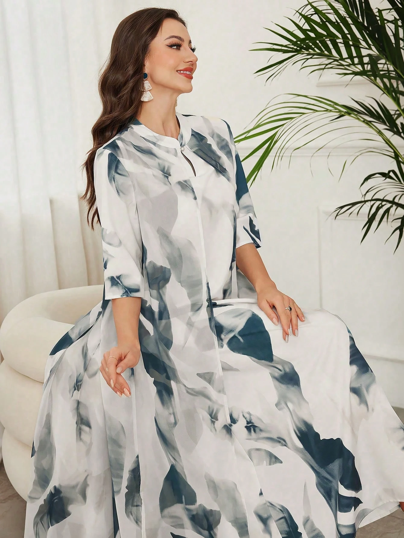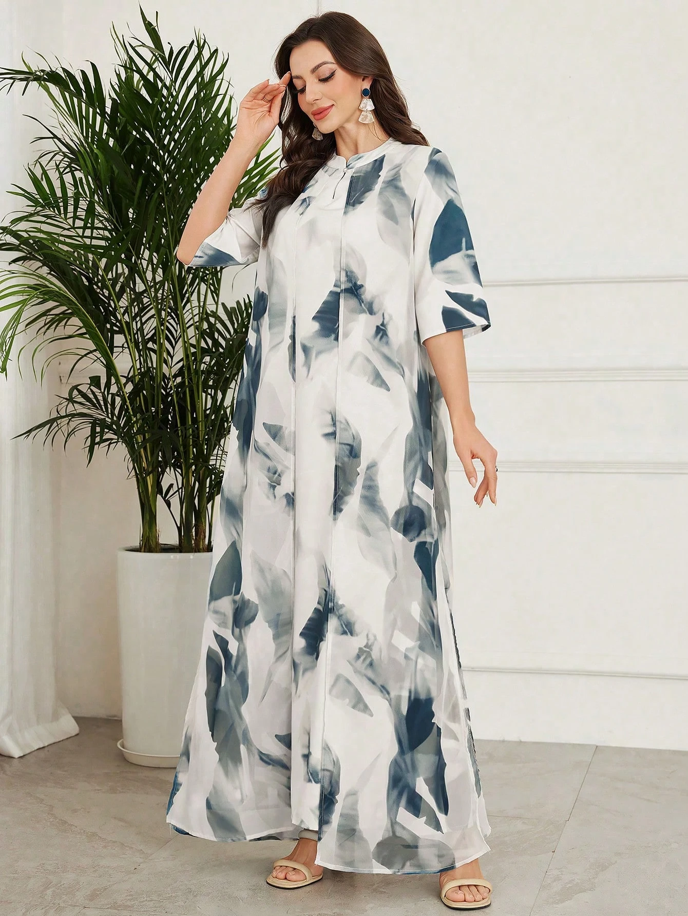 فستان كاجوال عربي أنيق للنساء بأكمام قصيرة وطباعة صبغة الربط لطبعة نموذجية