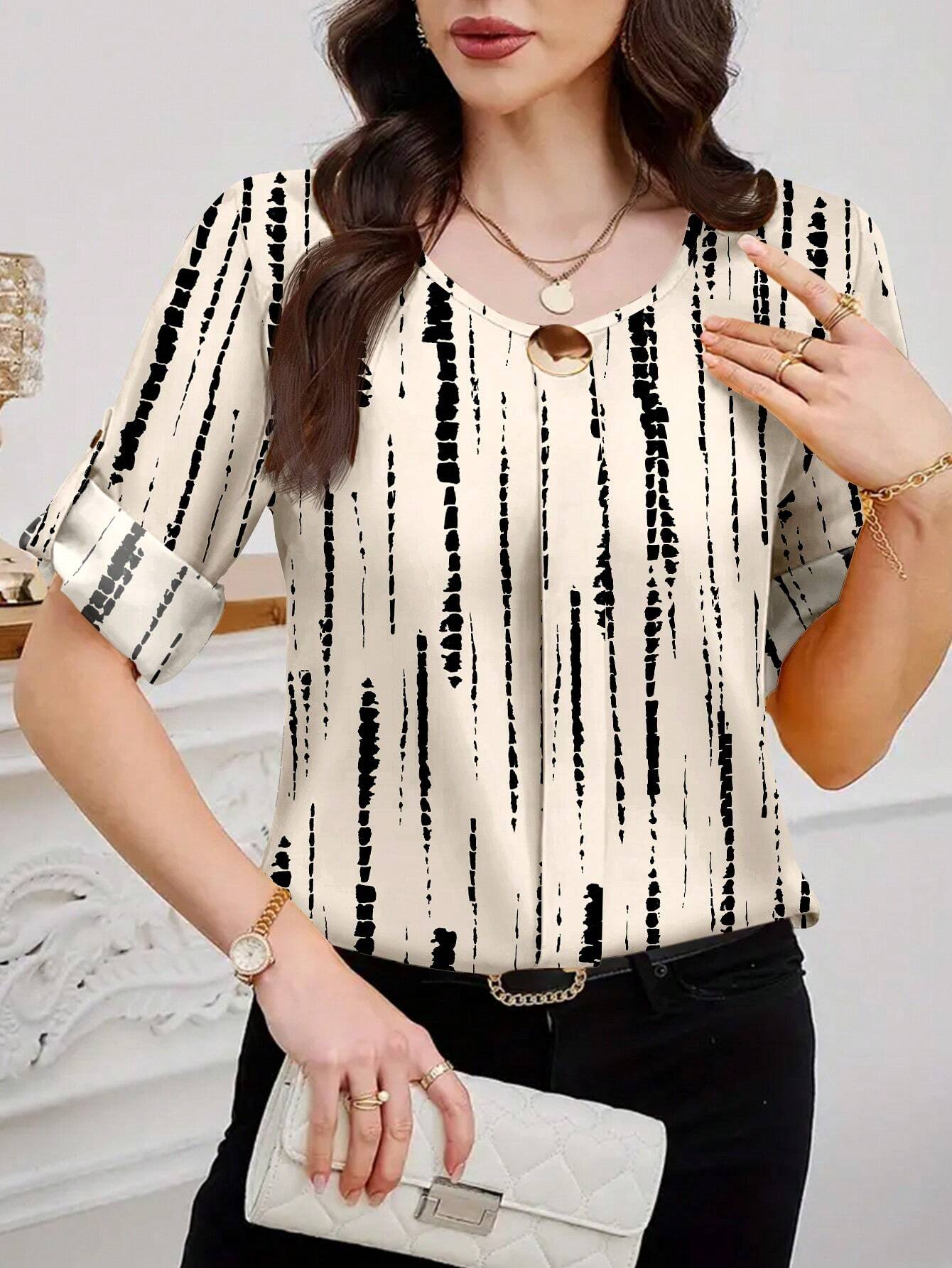 بلوزة صدرية مزخرفة بأزرار ذات طباعة جيومترية للياقة الدائرية، أنيقة للعمل والخروج في فصلي الخريف والشتاء