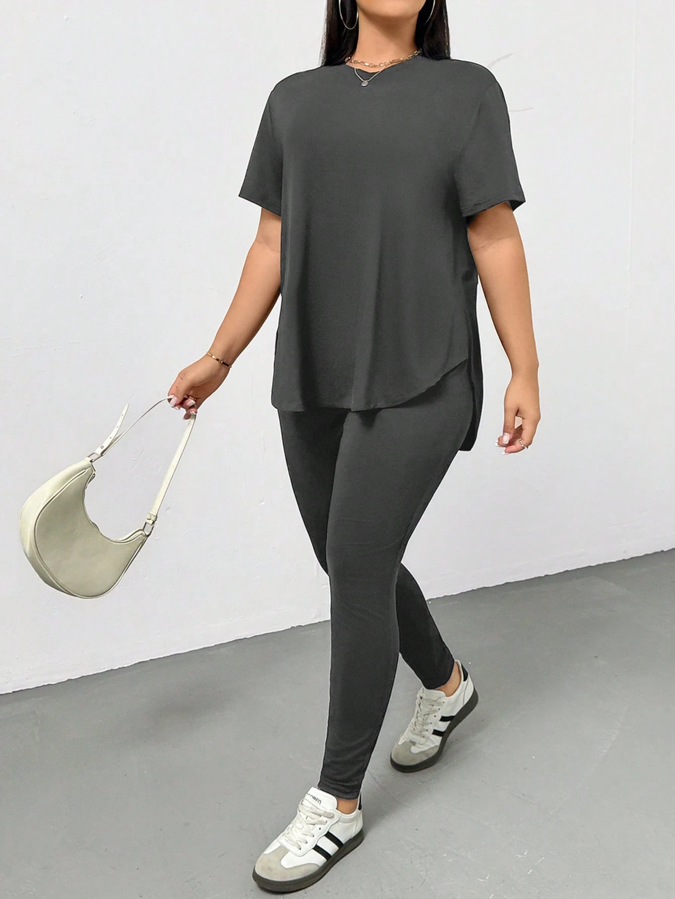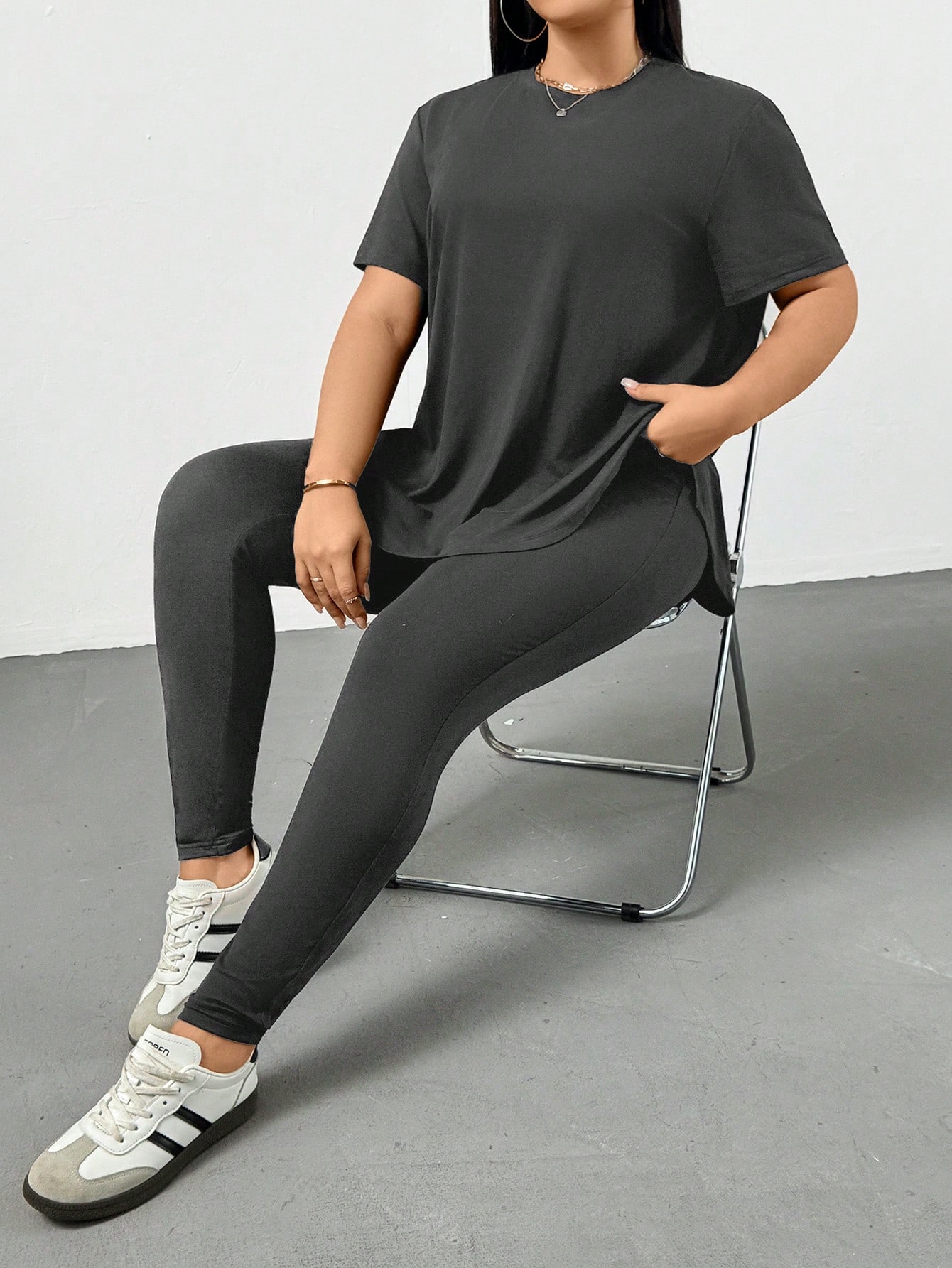 مجموعة قطعتين تي شيرت أسود أكمام قصيرة وسراويل ليجنز متساق للبس اليومي والرياضة الكاجوال للمرأة البدينة, ملابس مريحة وبسيطة مناسبة للخروج والمطار وأوقات الراحة الصيفية، ملابس أنيقة أنماط والحد الأدنى