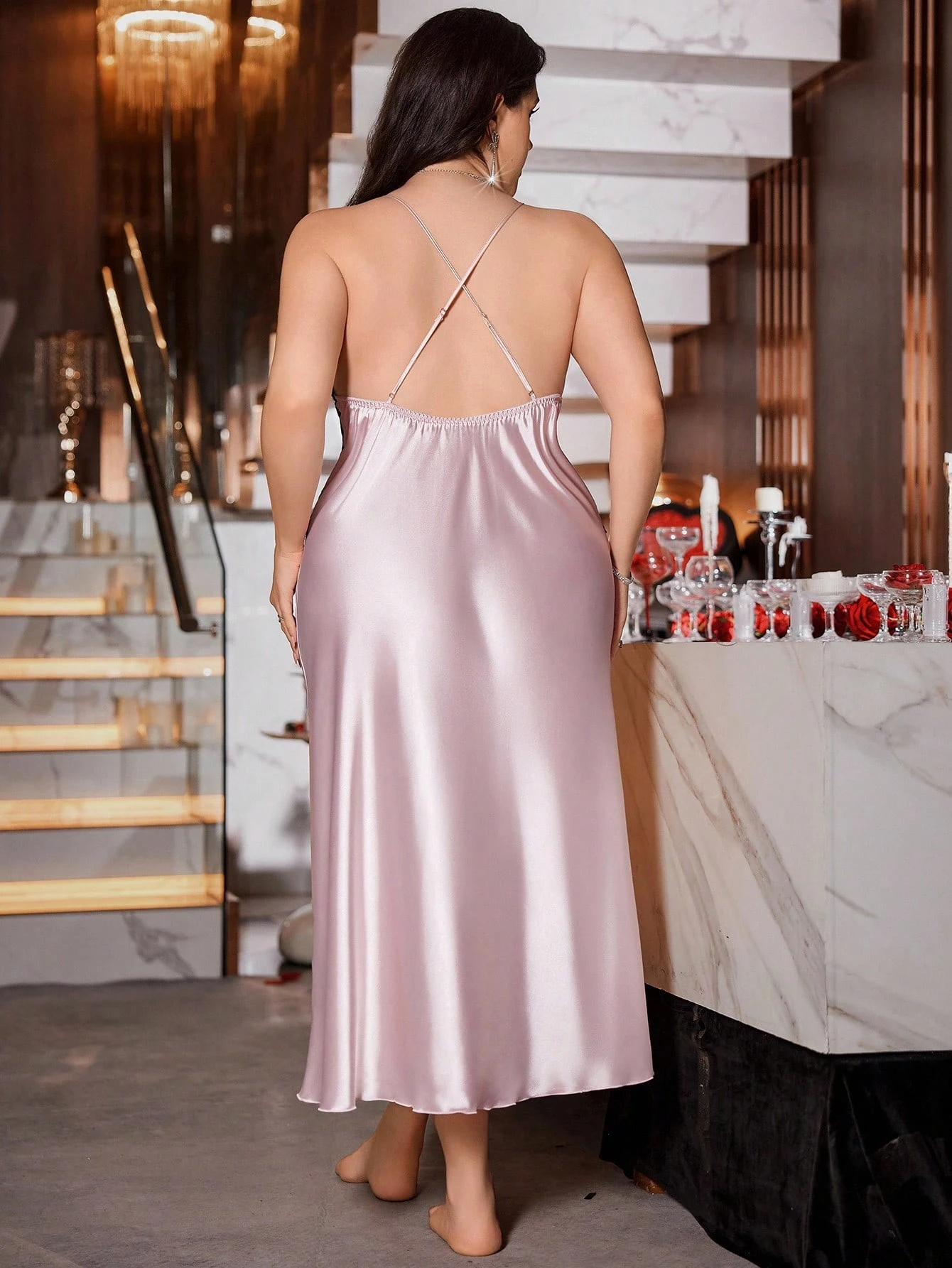 فستان نوم ساتان وردي أنيق مقاسات كبيرة بتطريز دانتيل للنساء، يمكن ارتداؤه خارجياً فى جميع المواسم