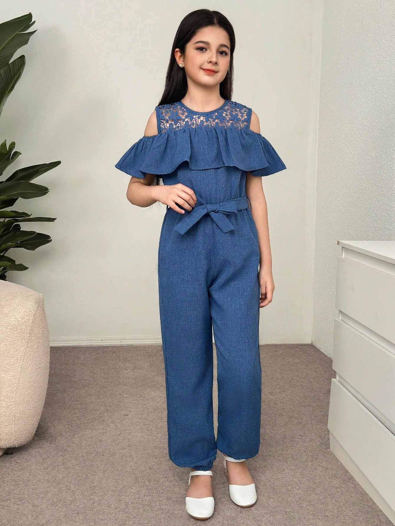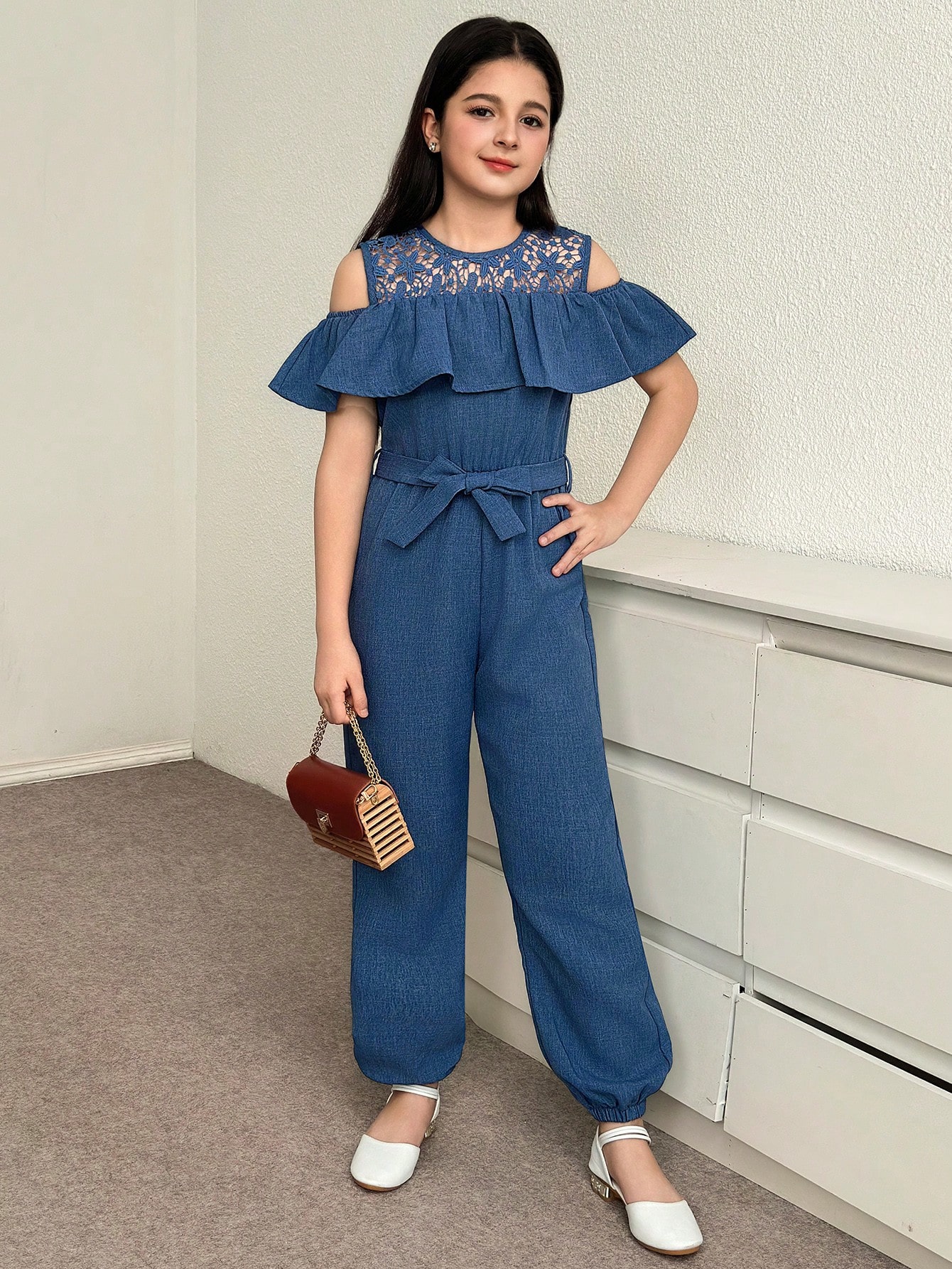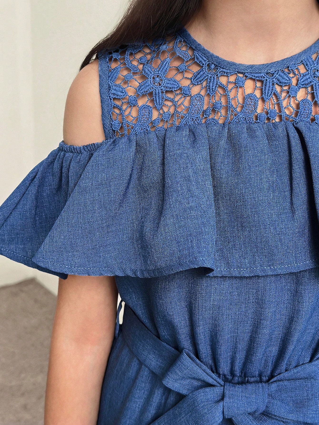 بدلة قفاز فضفاضة ذات وسط مطاطي مزين بالدانتيل وتركيمات الكشكشة والحزام للفتيات المراهقات في العطلات
