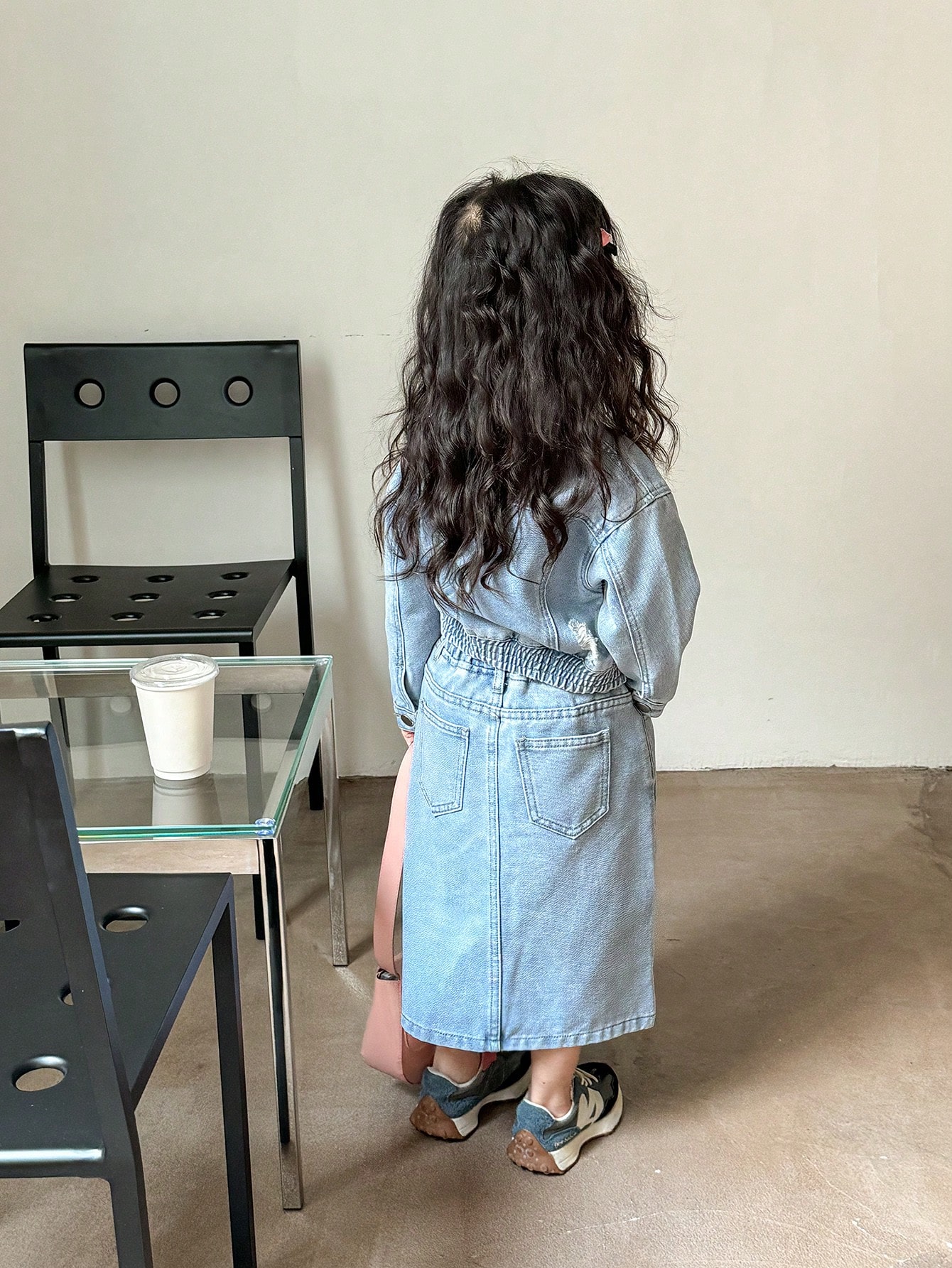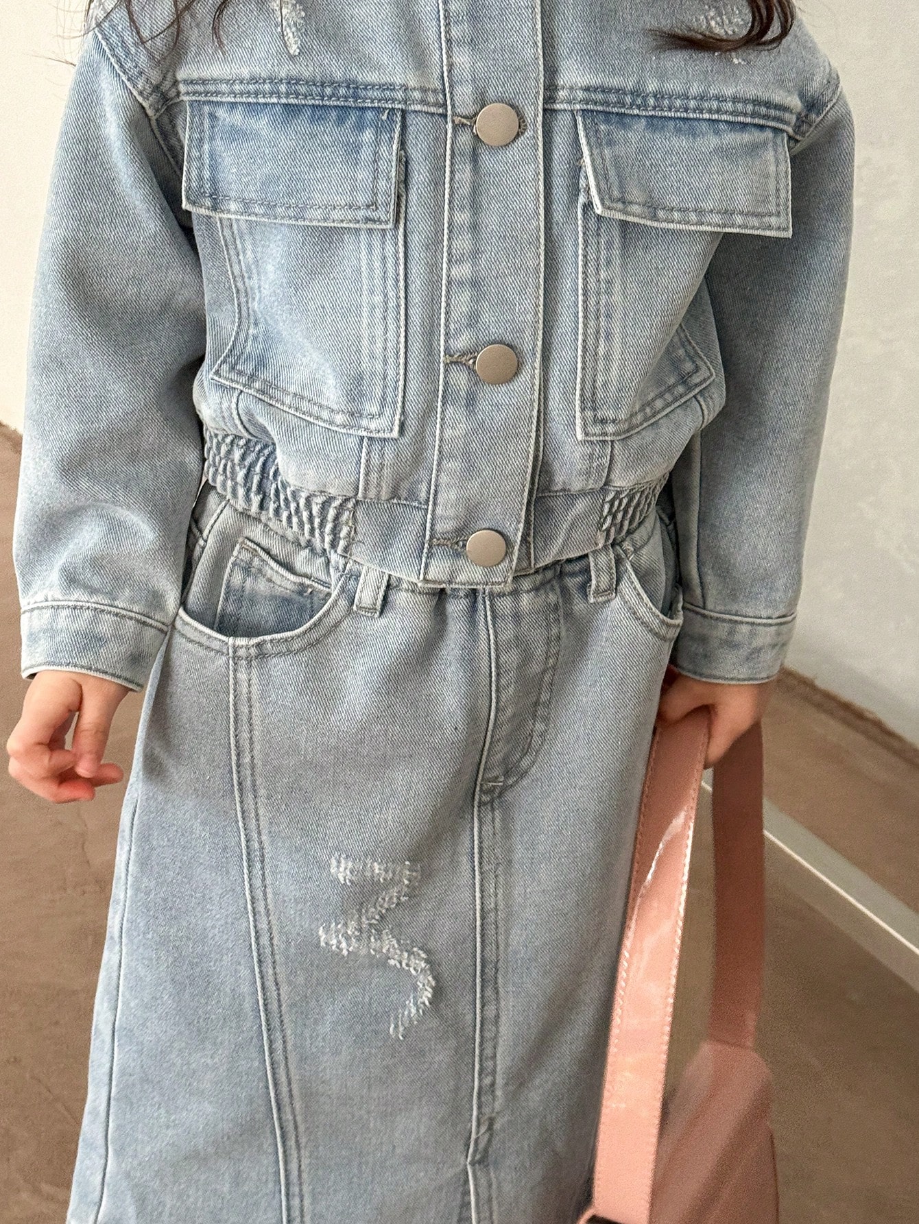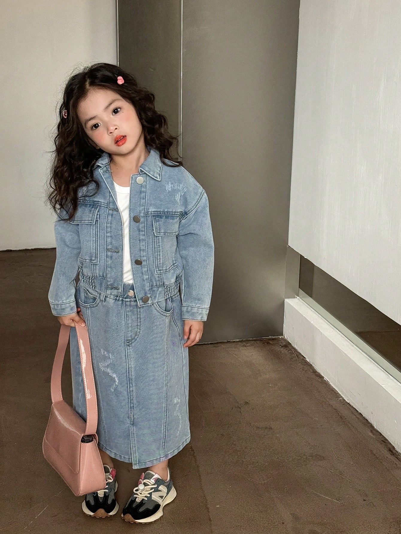جاكيت جينز وتنورة متوسطة للبنات الشابات بستايل شارع عارضة , بألوان باهتة ومظهر مغسول , جيوب كبيرة , اساور وحزام مطاطية , تفاصيل جانبية ممزقة وجيب سحاب أمامي