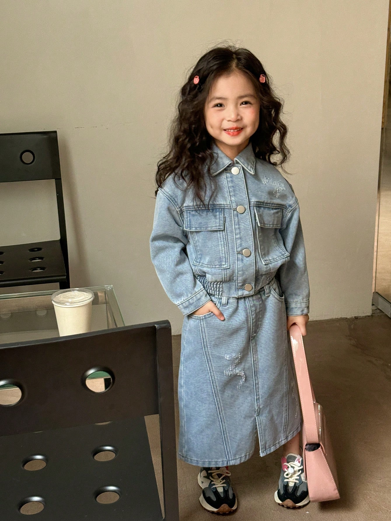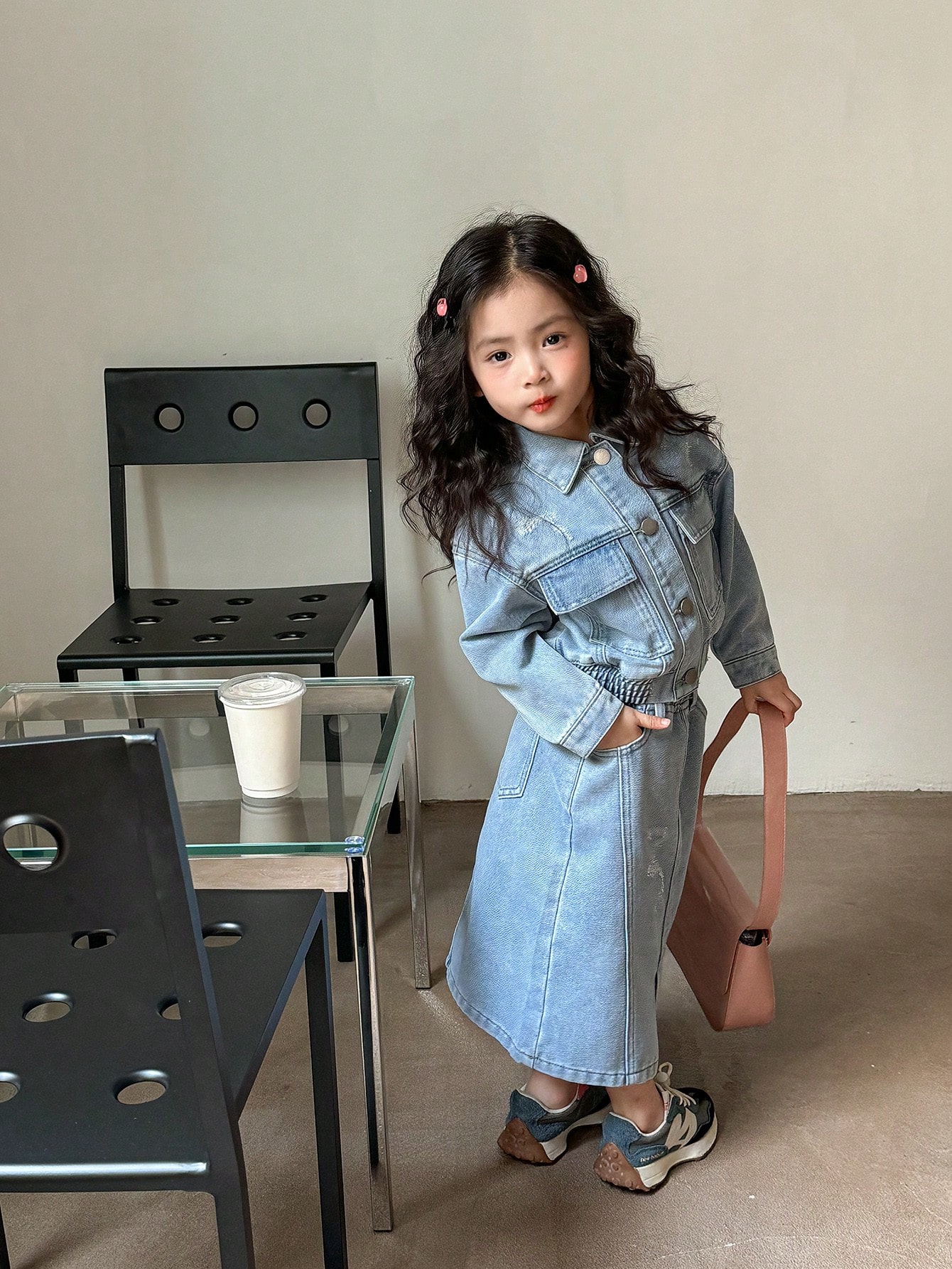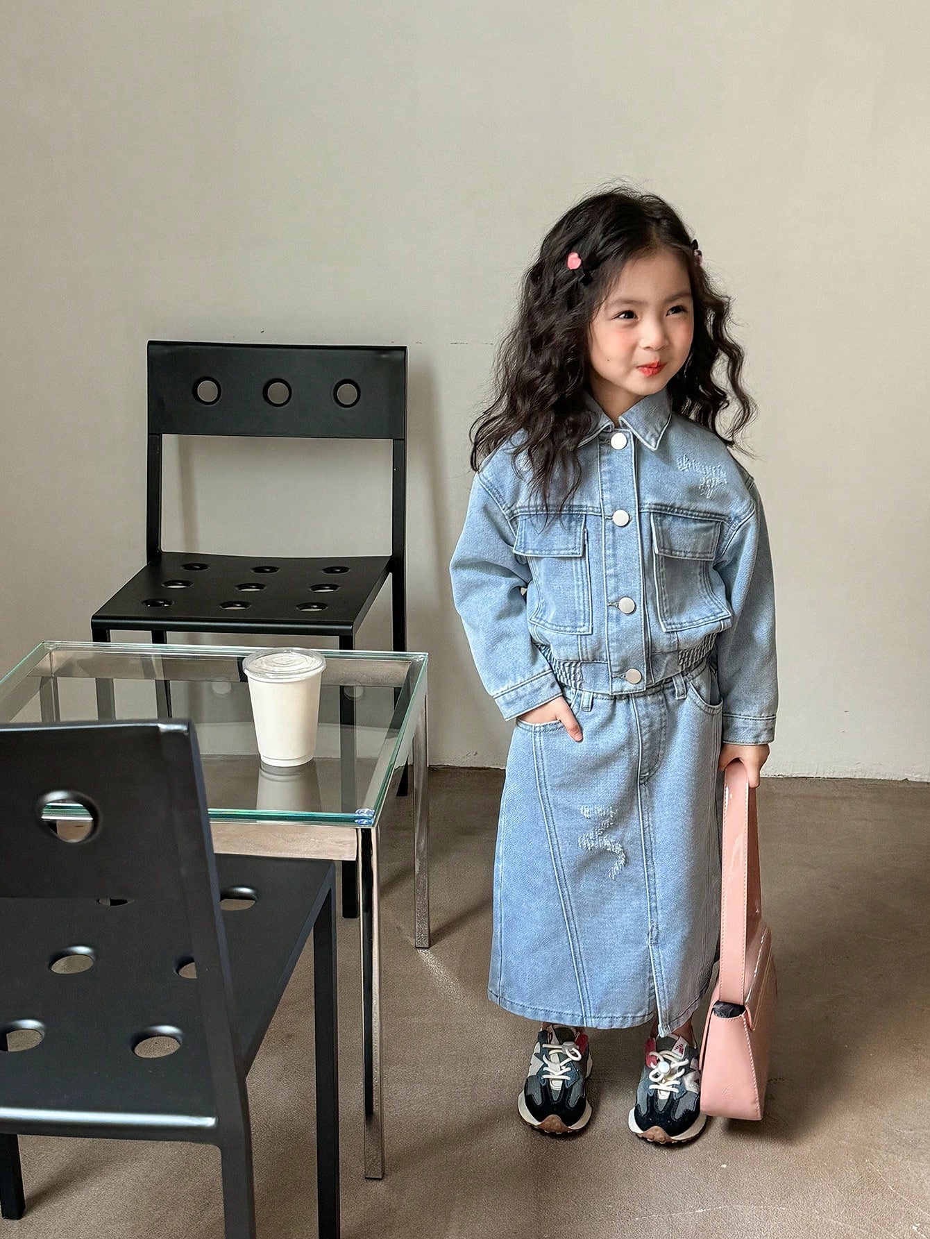 جاكيت جينز وتنورة متوسطة للبنات الشابات بستايل شارع عارضة , بألوان باهتة ومظهر مغسول , جيوب كبيرة , اساور وحزام مطاطية , تفاصيل جانبية ممزقة وجيب سحاب أمامي